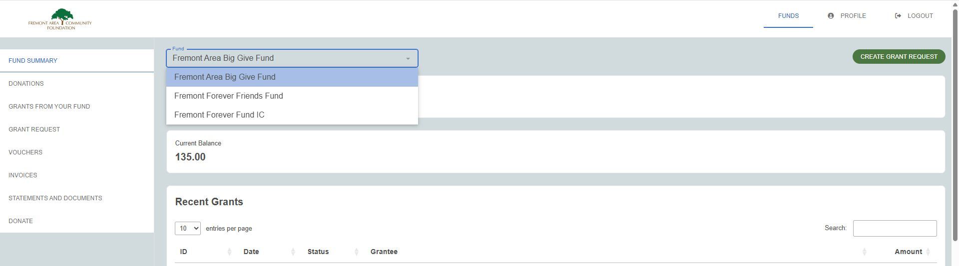 - Grant History: Lists each individual grant made from the fund, starting with the most recent.